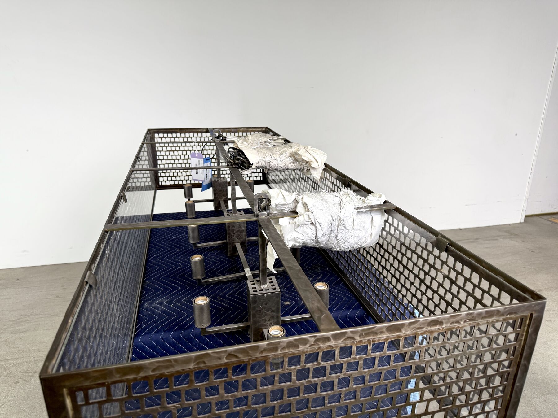 DESCRIPTION: Hand-forged iron frame and arms with hammered texture