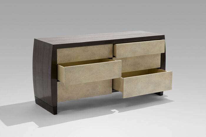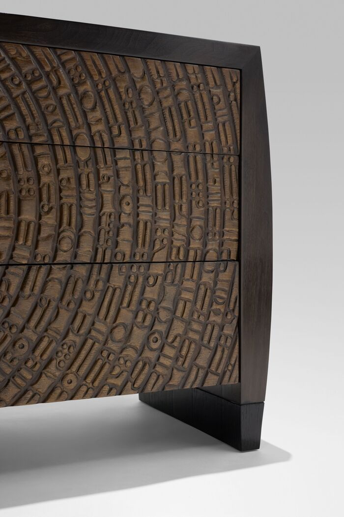 Cabinet: Walnut Stains, Sumatra; DRAWERS: Walnut Stains, Slate grey; DRAW DETAIL: KAME CARVING; BASE DETAIL: Walnut Stains, Ebony