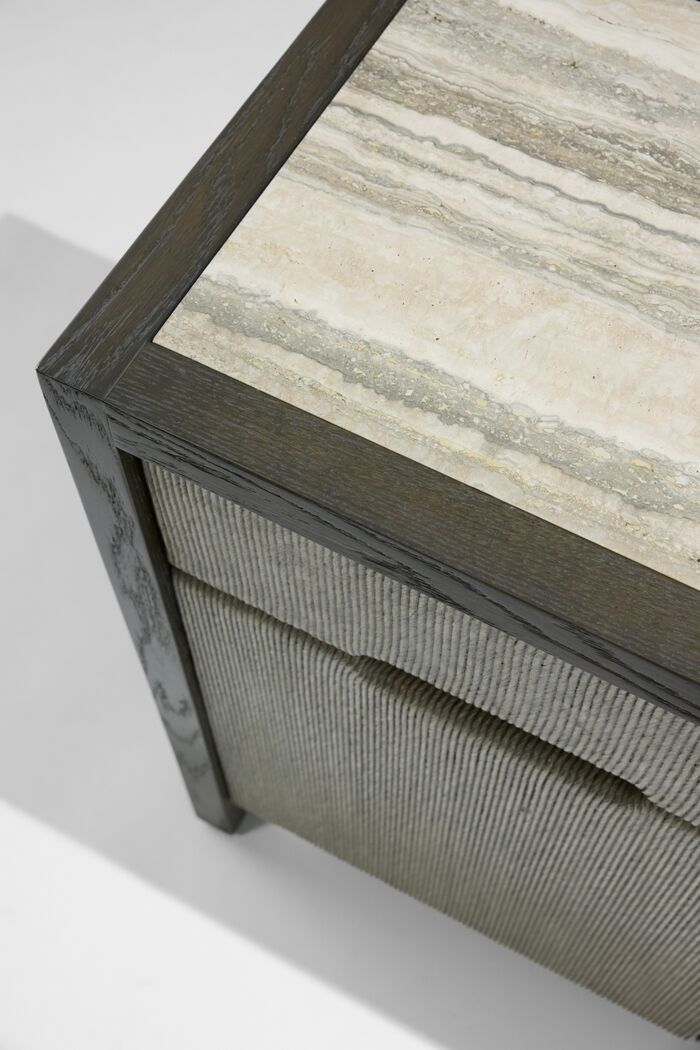 Cabinet: Oak Stains, Dolomite; Rush Finish, Karoo; Stone Top: Travertine (filled, honed)