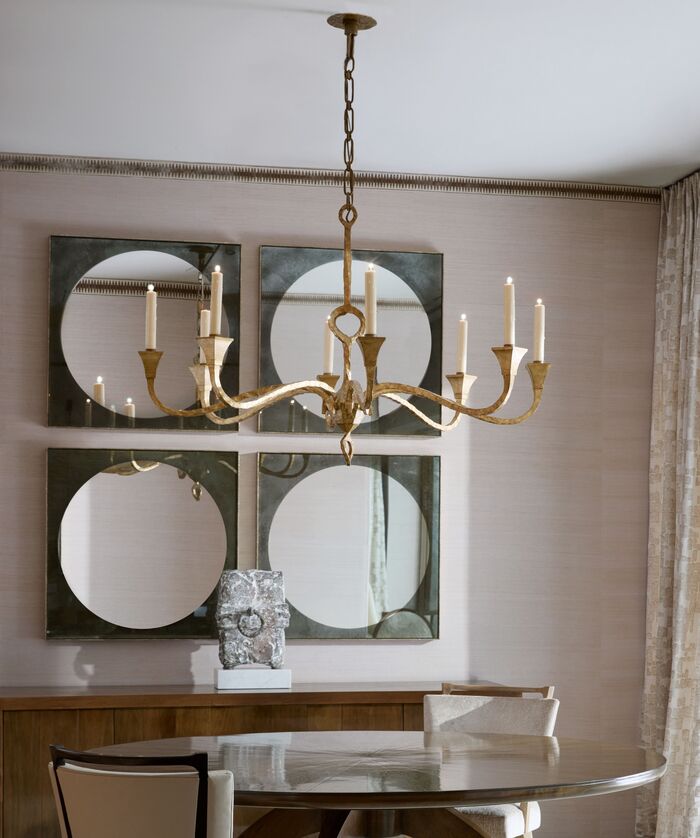 Gilded iron Finishes: Worn Aged Gold, Arms: Waxed candlesleeves for candelabra bulbs