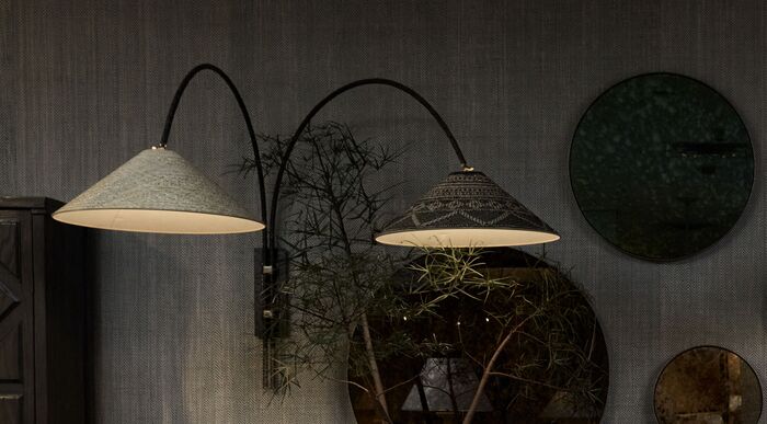 Iron Finishes: Desert Black, Architectural Bronze Finishes: Light, SHADES: Natural & Black Diamond Raffia with Off-White Mayka silk interliner. Natural Diamond Raffia
