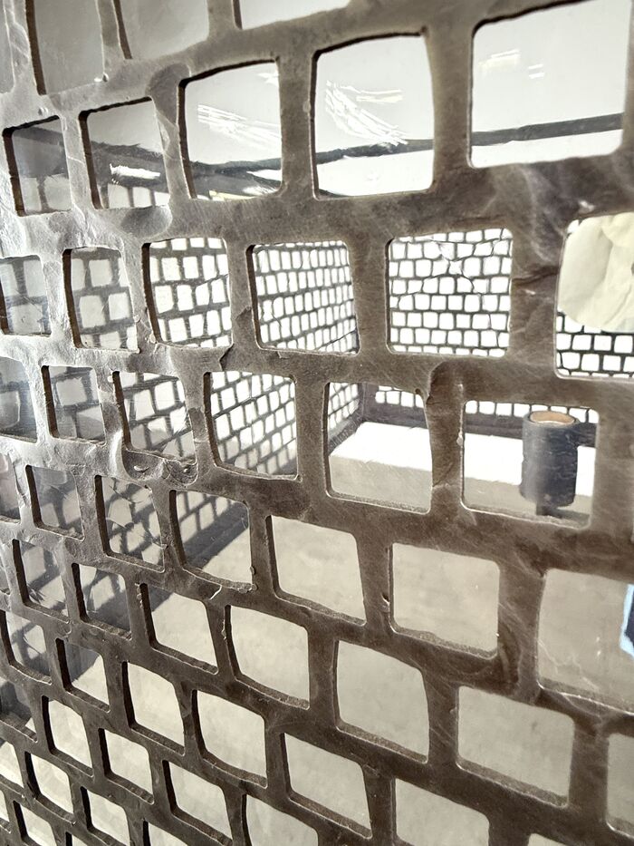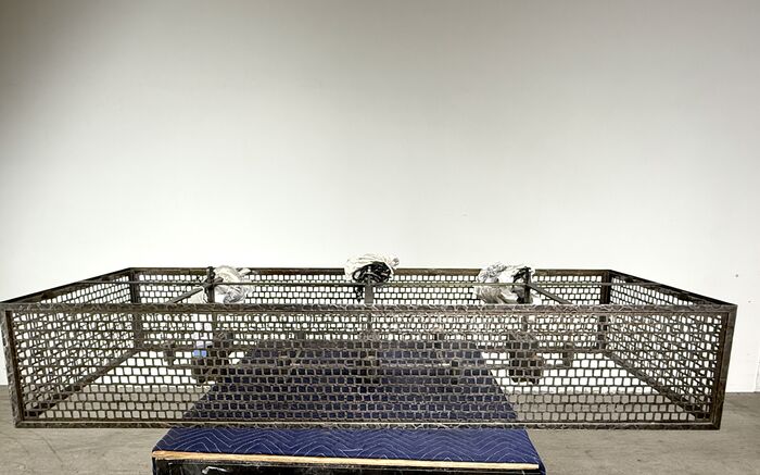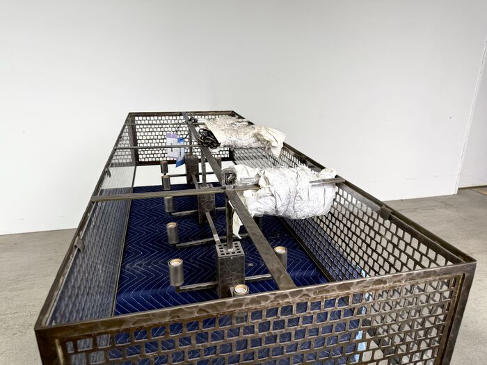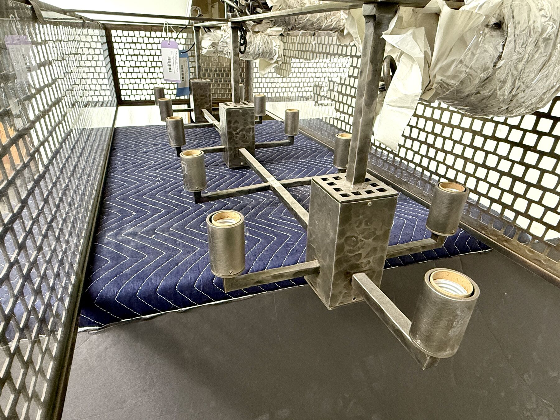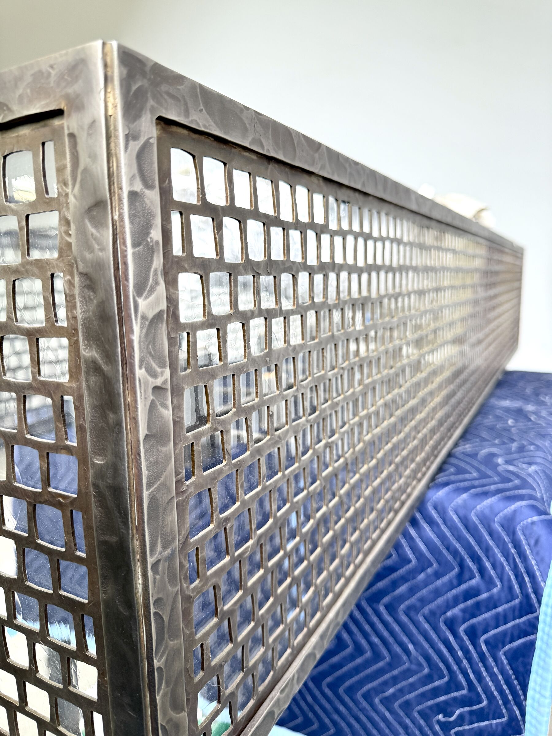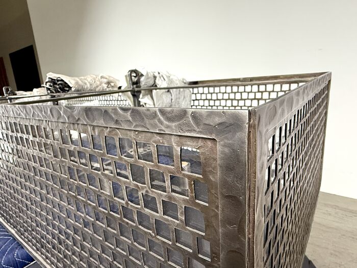 DESCRIPTION: Hand-forged iron frame and arms with hammered texture