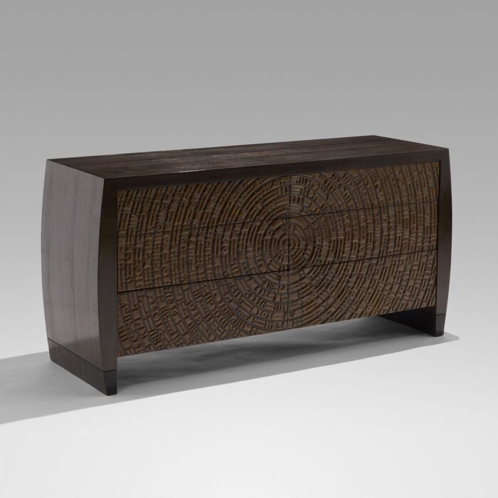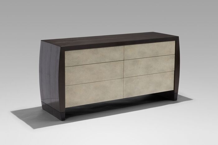 Cabinet: Walnut Stains, Sumatra; DRAWERS: Walnut Stains, Slate grey; DRAW DETAIL: KAME CARVING; BASE DETAIL: Walnut Stains, Ebony