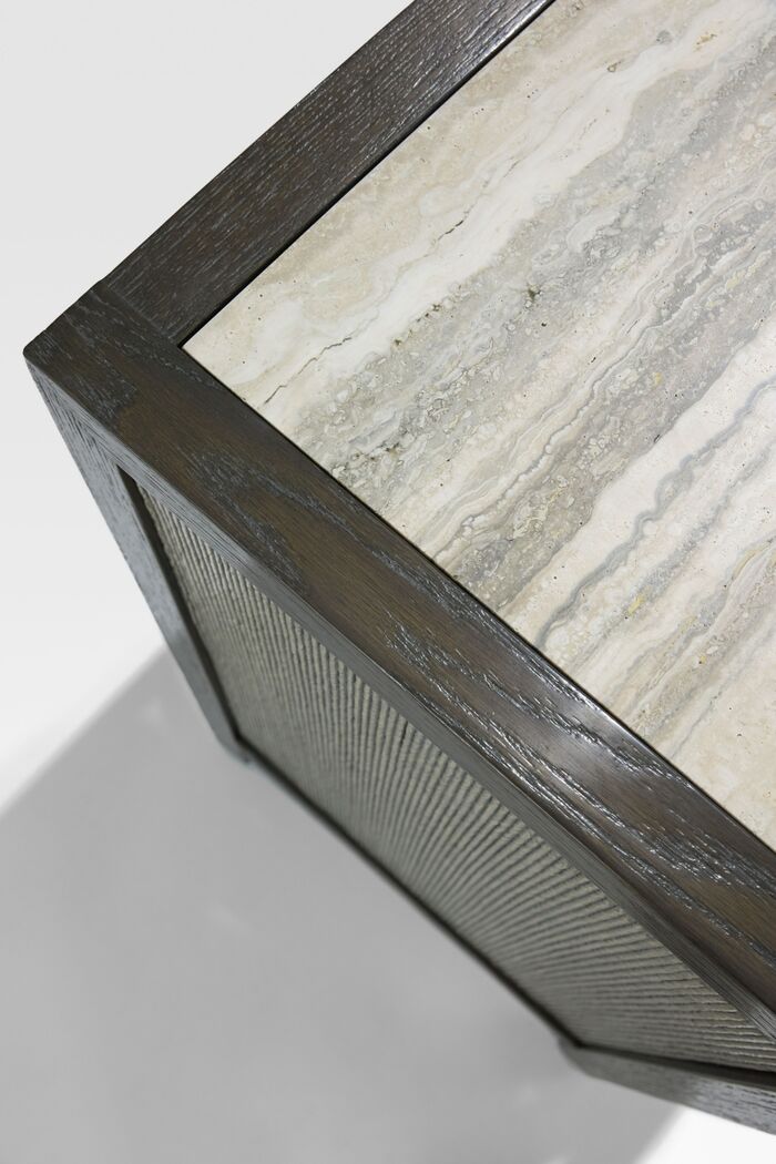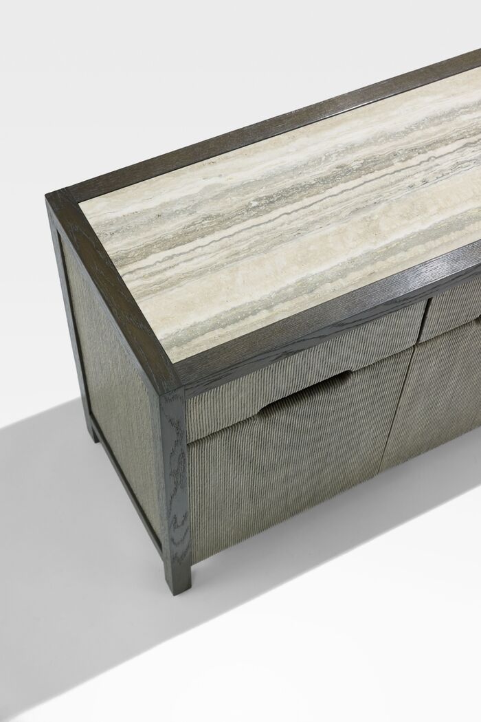 Cabinet: Oak Stains, Dolomite; Rush Finish, Karoo; Stone Top: Travertine (filled, honed)