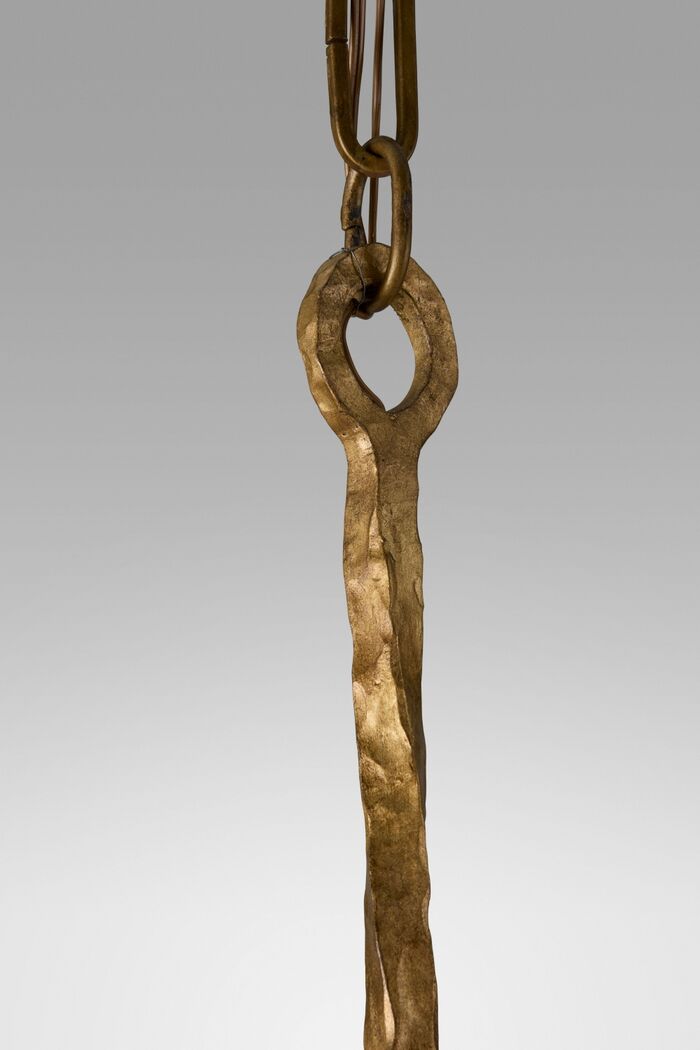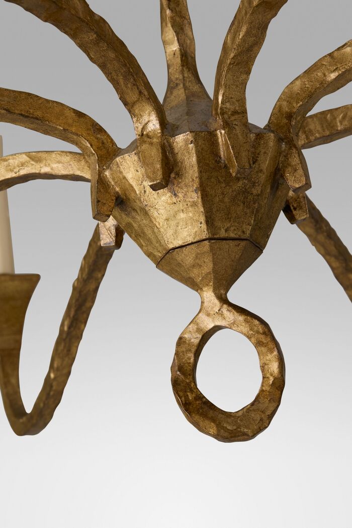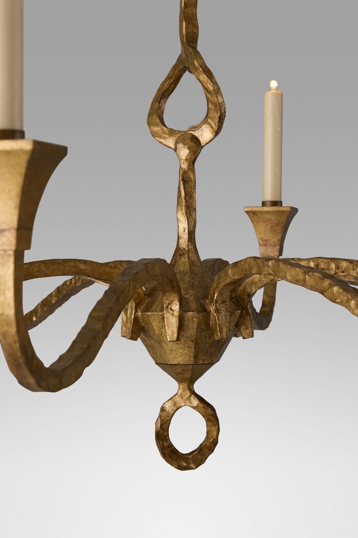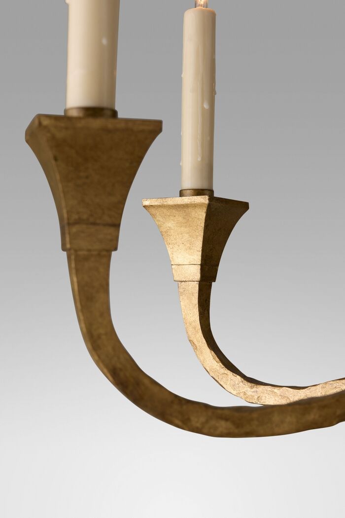Gilded iron Finishes: Worn Aged Gold, Arms: Waxed candlesleeves for candelabra bulbs
