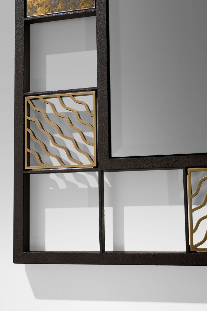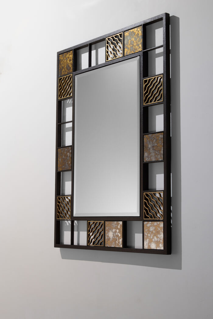 FRAME: Iron Finishes, Desert Black, TILES: Antiqued Gold Mirror, Architectural Bronze Fretwork, MIRROR: Beveled Clear Colorless