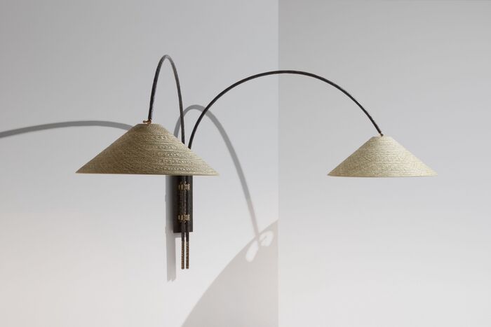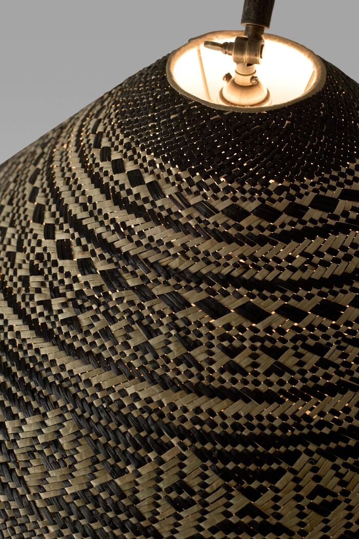 Iron Finishes: Desert Black, Architectural Bronze Finishes: Light, SHADES: Natural & Black Diamond Raffia with Off-White Mayka silk interliner